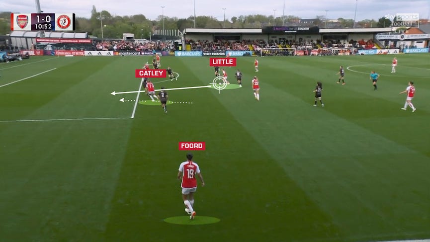 Against Bristol City, Arsenal decided to, essentially, use five forwards to match up Bristol City’s back five. In essence, it was Blackstenius upfront pushing the Bristol line backwards, while Mead rolled into central positions alongside Russo, Catley underlapped on the left inside of Foord, who held the width. While Emily Fox often played like a right winger, though she also often came inside and popped up in number 10 like positions.